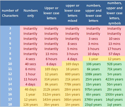 un tableau qui indique la force des mots de passe en fonction de leurs complexité.