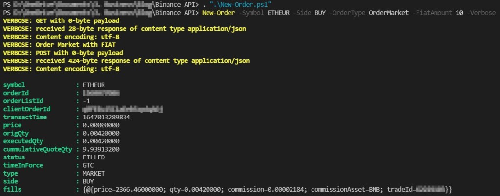 New-Order -Symbol ETHEUR -Side BUY -OrderType OrderMarket -FiatAmount 10 -Verbose