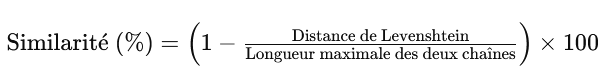 Le pourcentage de similarité est calculé en soustrayant le rapport entre la distance de Levenshtein et la longueur maximale des deux chaînes de 1, puis en multipliant le résultat par 100 pour obtenir un pourcentage. La longueur maximale est utilisée comme dénominateur pour normaliser le score de similarité sur une échelle de 0 à 100, où 100 signifie que les chaînes sont identiques et 0 qu’elles sont totalement différentes.